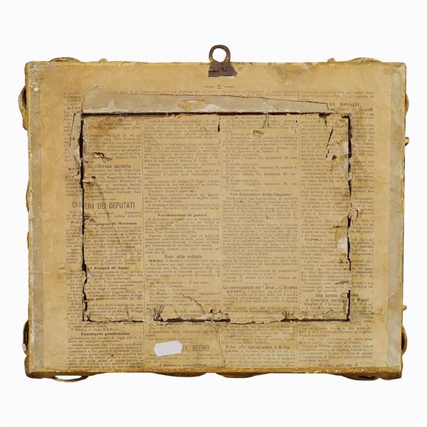 "Lucrezia's suicide", oil on paper applied on rigid cardboard, within a golden wood frame, 19x23,5 cm.