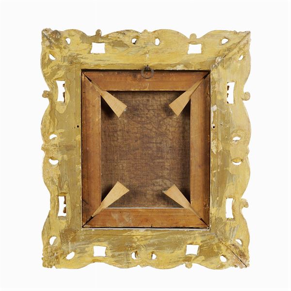 "Interior with characters and animals", oil on canvas, framed in golden wood and carved with vegetal and volute patterns, 26x22 cm.
