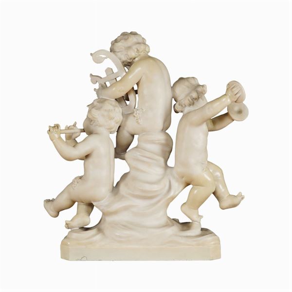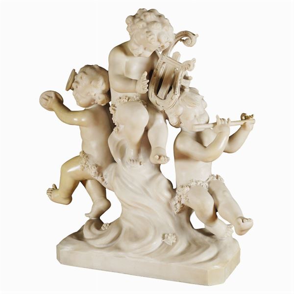 white marble statuette group carved to represent putti musicians on a square base and signed on the back F. Vichi, resting on green lawn marble column, h. 95 cm., Wear and restoration. Provenance: Roman private collection