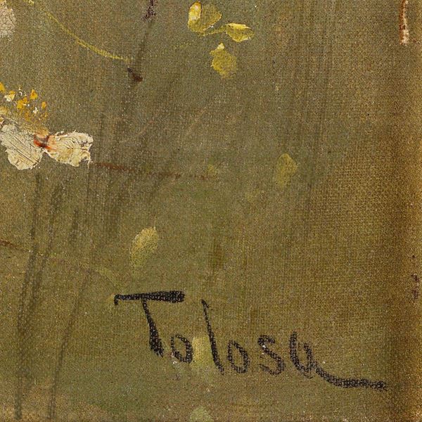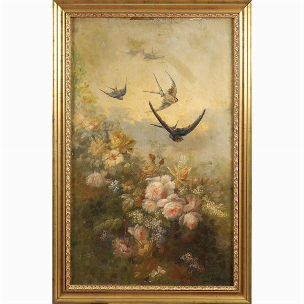 "Still life with flowers and swallows", pair of oils on canvas, signed in Tolosa at the bottom right, framed, 100X61 cm.