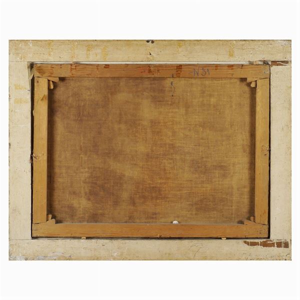 "Landscape with characters and ruins", oil on canvas, within golden and lacquered wood frame, 76,5x102 cm.