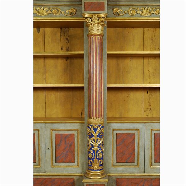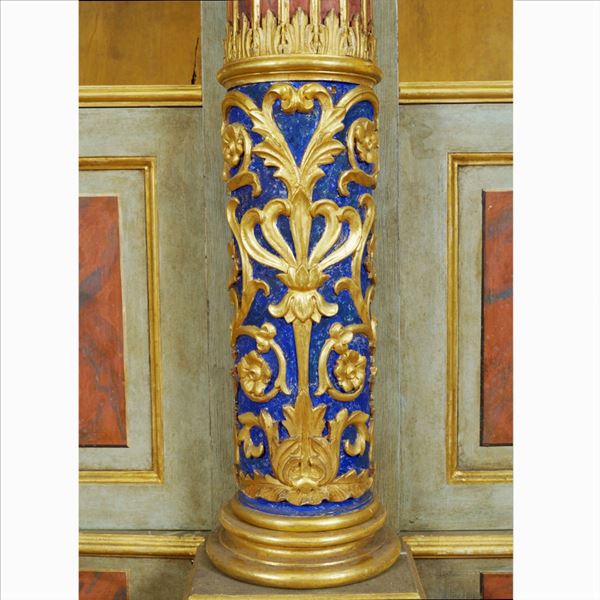 elements of the 17th century assembled on a manufacturing structure of the first half of the 900, border outlined by three grooved columns with capitals and finely carved friezes with vegetal patterns, 254x298x62 cm.