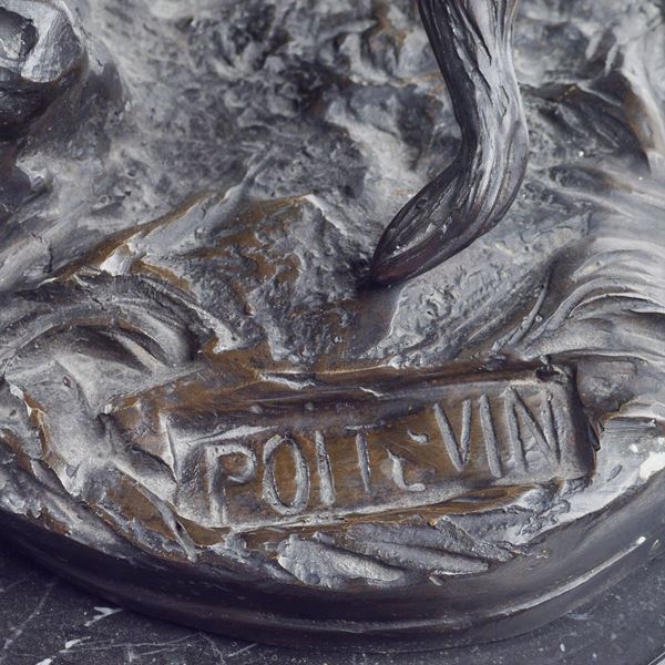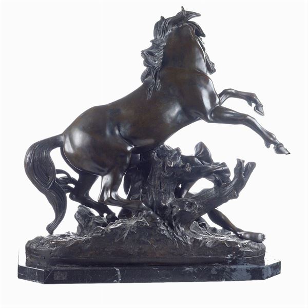 burnished bronze group depicting a wild horse held by a groom, signed at the base, resting on an octagonal marble base. Provenance: Roman private collection, 56x50x24 cm.