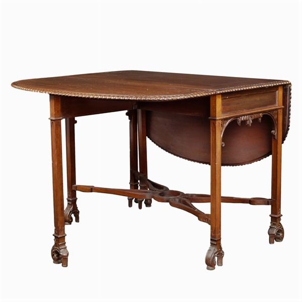 piano con profilo baccellato poggiante su quattro sostegni quadrati riuniti al centro da crociera ed elementi in legno intagliato con motivi vegetali, lievi difetti. 74x99x135 cm. (aperto)
