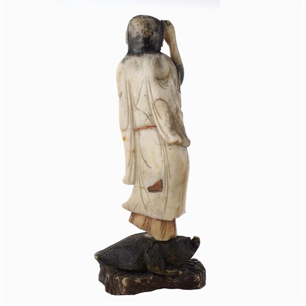 painted in polychrome, resting on a carved base with mythological animal patterns on rock, slight defects
