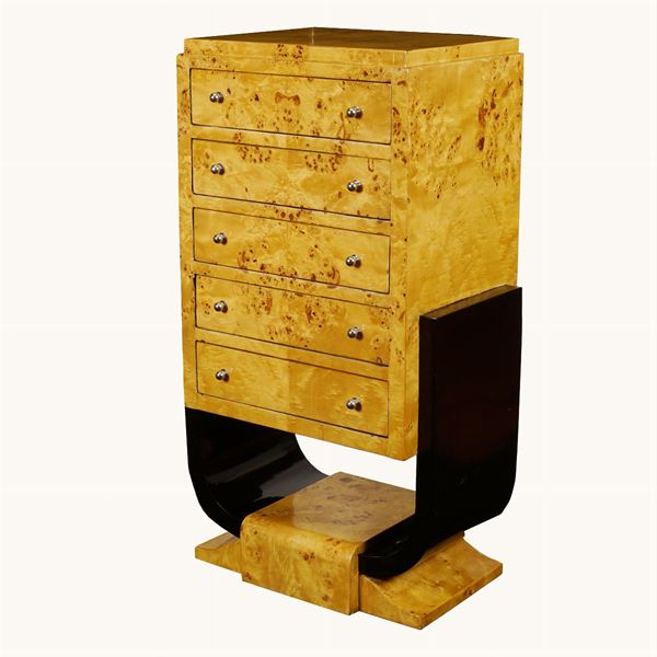square frame with five drawers featuring silver-plated metal knobs, joined to the base by two wavy line supports in ebonized wood
