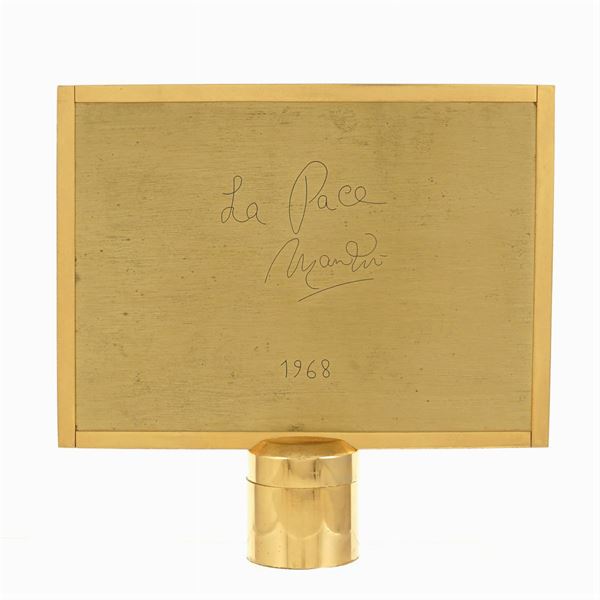 "Peace" low-relief sculpture in silver 925, 1969, ex. LVIII / C, signed at the bottom right, title and year engraved on the back, mounted on rotating golden bronze frame, photo certified by the Giacomo Manzù Foundation, 13,5x20,5 cm.