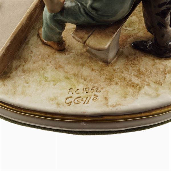 "The game of bowls", polychrome porcelain group, signed by G. Cappè and dated 1969 on the side, 18x49x20 cm.
