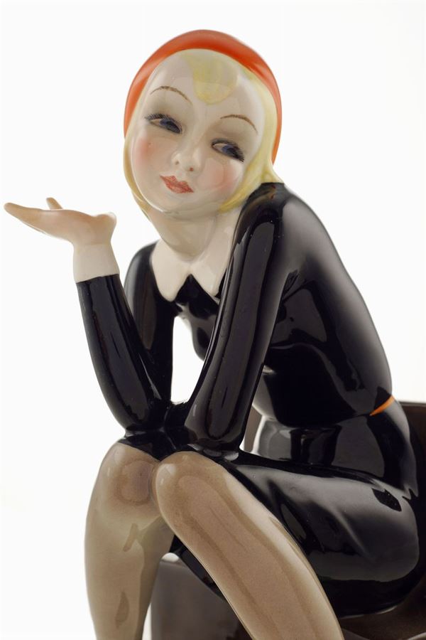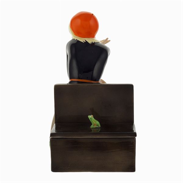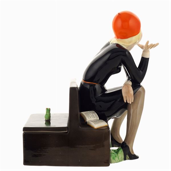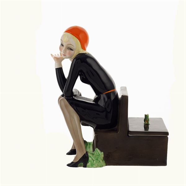 'Nella', a Lenci earthenware enamelled in polychromy figure by Helen Konig Scavini, modelled as a young woman sitting on a bench with a book open beside her, on the other side of the bench is an open box, marked "Lenci, made in Italy, 28.6.932" under the base , 24x12x17 cm.