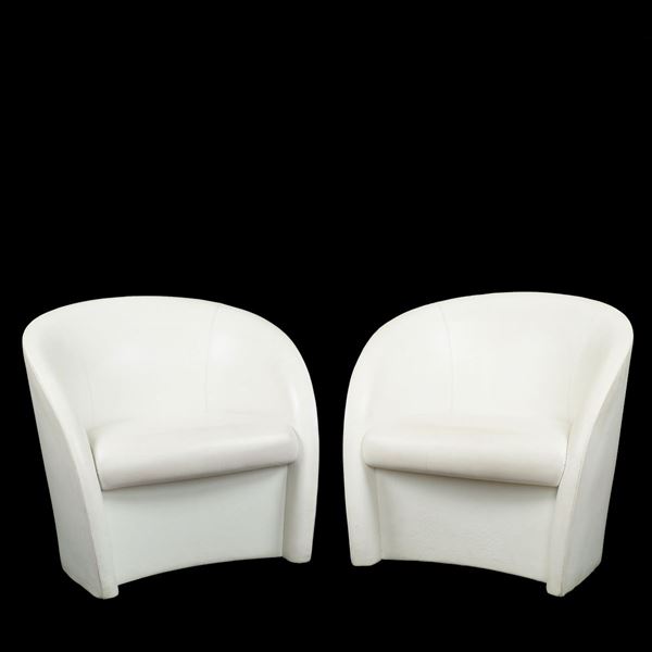 "Intervista", pair covered in leather armchairs, with casters, marked Poltrona Frau brand, signs of use, 83x71x68 cm.