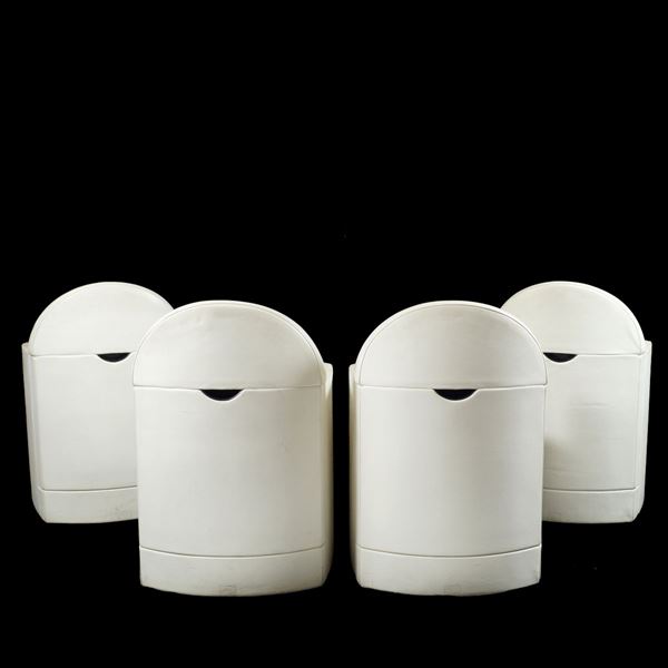 "Ego meeting", four chairs, steel structure entirey covered with leather, with wheels and handle on the back of the backrest, marked Poltrona Frau brand, signs of use, 87x60x50 cm.