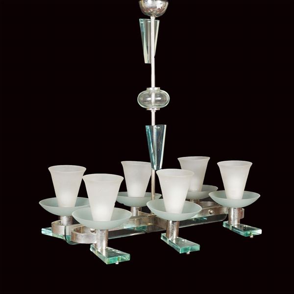 silver metal oval structure with transparent glass decorative elements, satin glass bulb holder, defects, 110x70x42,5 cm.