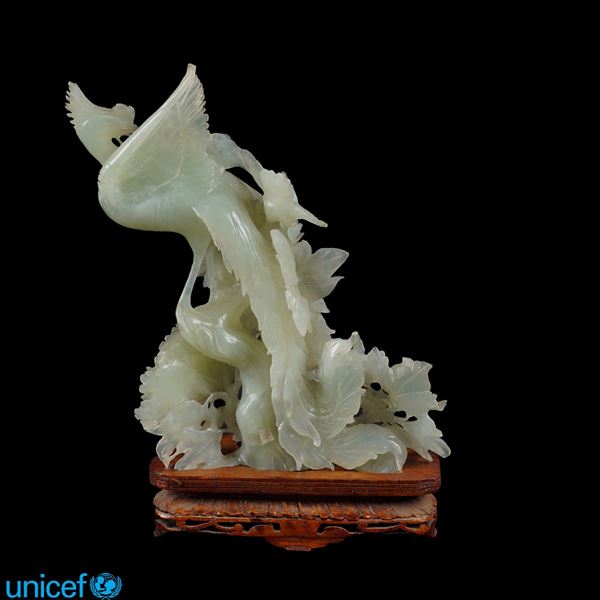 depicting a shoot of flowers with a bird, resting on a wooden base, defects, h. 22 cm.