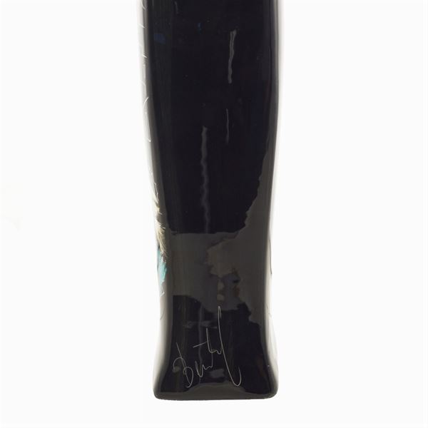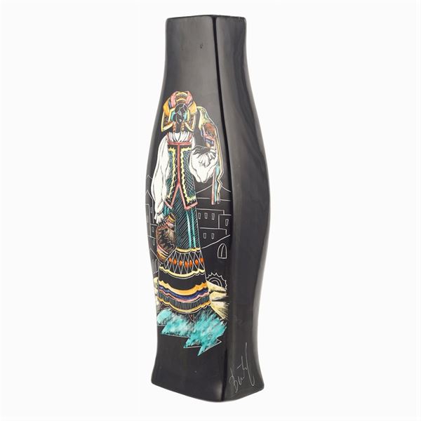enamelled and hand painted, decorated with a female figure in typical clothes on a black background, Sesto Fiorentino Scars manufacture, signed on the bottom right side, marked under the base, slight defects, 42x8x5.5 cm.