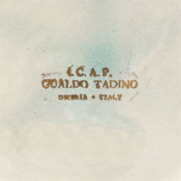 enamelled and hand painted, decorated with a seabed, golden colored base, marked under the base 'I.C.A.P Gualdo Tadino Umbria - Italy', defects, 29x11.5 cm.