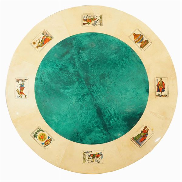 Bridge table, composed by table and 4 chairs in walnut and glazed parchment, decorated with Neapolitan cards, table measures, cm. 120x75, height of the chairs, cm. 107