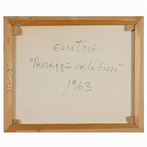 "Paesaggio calabrese", 1969, oil on canvas, signature at the bottom left, title, date and signature on the back, framed, 50x60 cm.