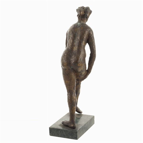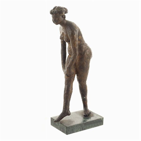 "Female nude", burnished patina bronze sculpture, not signed, h. 26 cm.