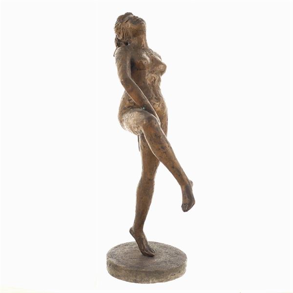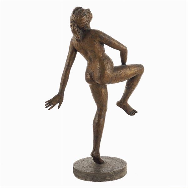 "Female nude", burnished patina bronze sculpture, signed under the leg, h. 36 cm.