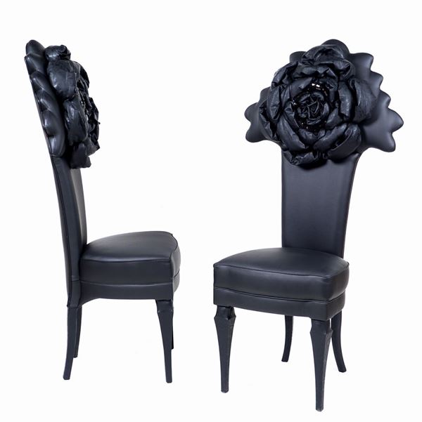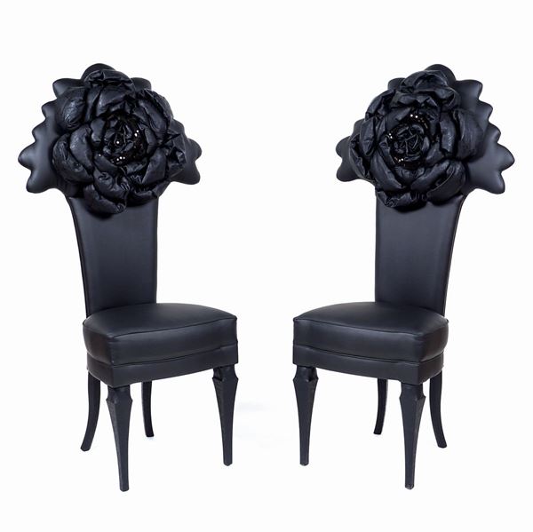 wooden structure fully upholstered and covered in black faux leather and fabric, shaped backrest centered by a damask flower with paillettes, 147x48x55 cm.
