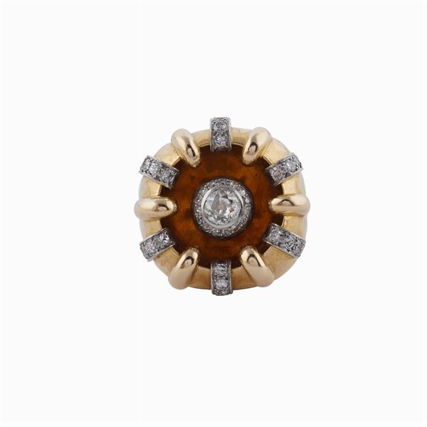 antique brilliant cut central diamond approx. 0.70 ct surrounded by brilliant cut diamonds approx. 0.80 ct, size 17, peso 35 gr.