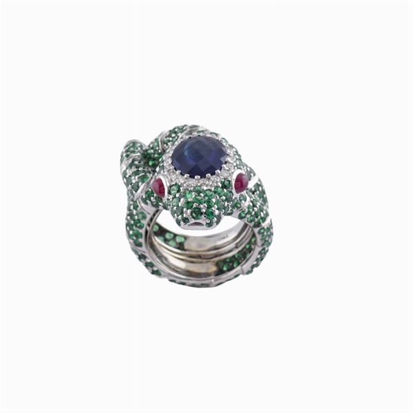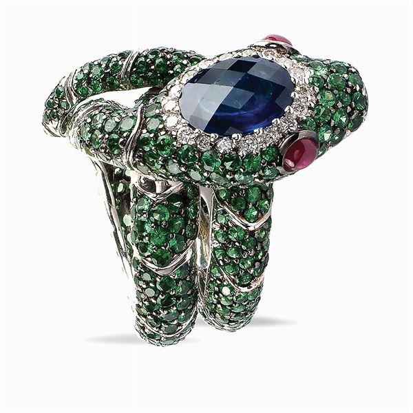 oval briolet cut sapphire approx. 3.50 ct surrounded by brilliant cut diamonds about 0.30 ct, round tsavorite approx. 6 ct and two cabochon cut rubies, size 14, peso 22 gr.