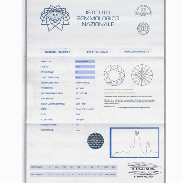 G color - VVS2 purity, zero fluorescence. Complete with I.G.N. gemological certificate n. 25536