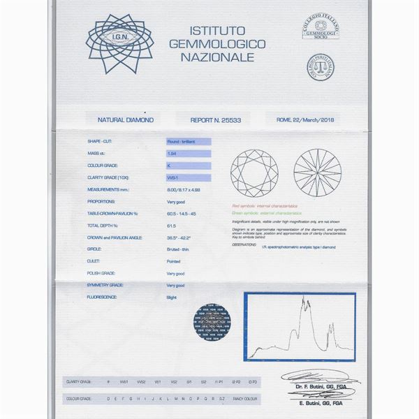 K color - VVS1 purity, light fluorescence. Complete with I.G.N.gemological certificate n. 25533