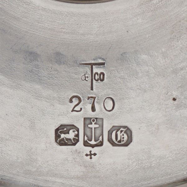 smooth body with vermeil interior and engraved profile, stem and handles chiselled with four male and female profiles, 17x24x20 cm., peso 764 gr.