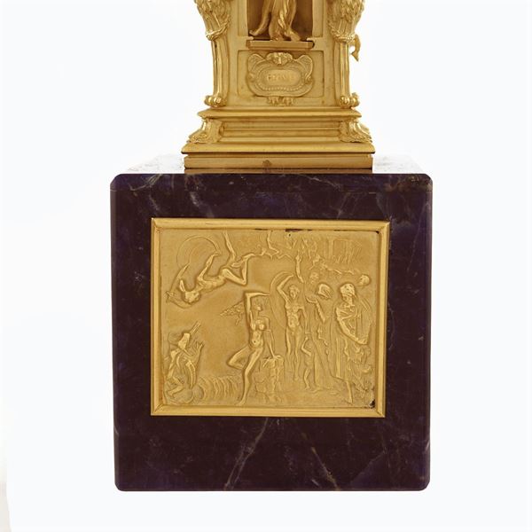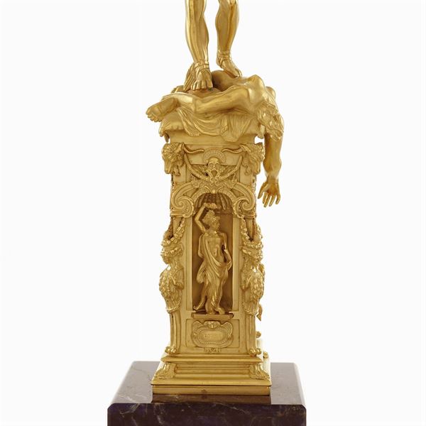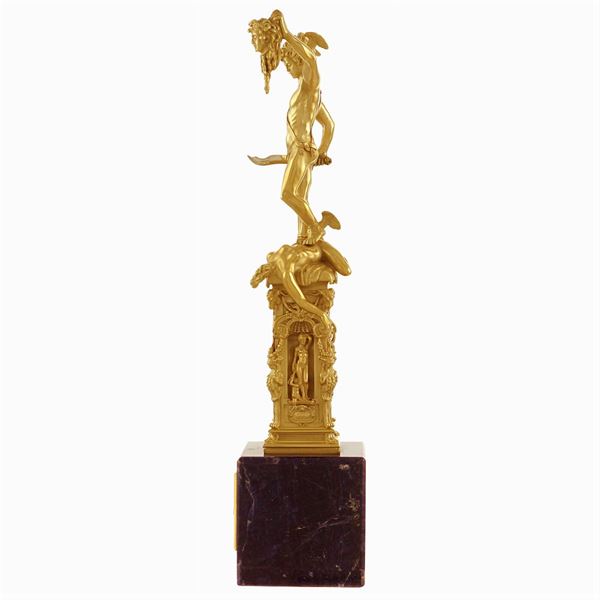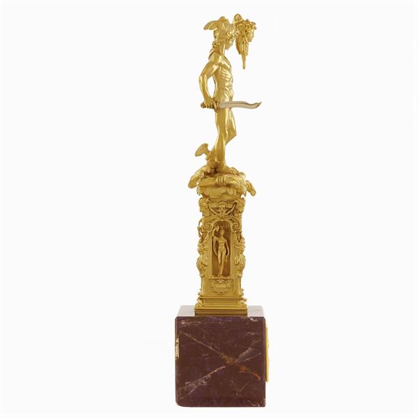 scolpita a tutto tondo a raffigurare Perseo con la testa di Medusa, rappresentato in piedi sul corpo di Medusa appena decapitata con la spada impugnata nella mano destra, mentre la sinistra solleva trionfante la testa del mostro tenuta per i capelli, poggiante su un elemento architettonico con quattro nicchie nelle quali sono collocate le statue di Giove, Mercurio, Minerva e Danae, su base squadrata in sodalite con bassorilievo rettangolare in oro giallo 18kt e raffigurante la liberazione di Andromeda, 27x6x6 cm.