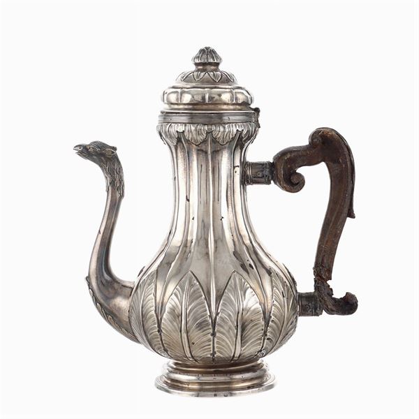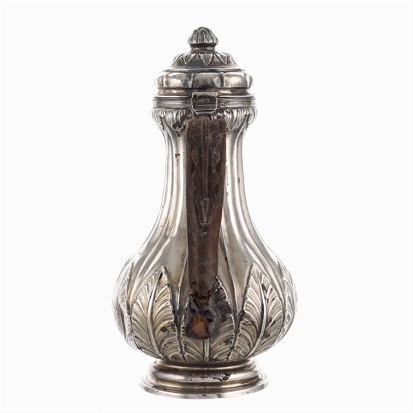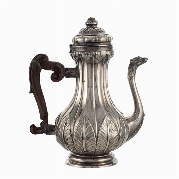 embossed and chiseled body with vegetal patterns, Griffon shaped beak, carved wooden handle, h. 30 cm.