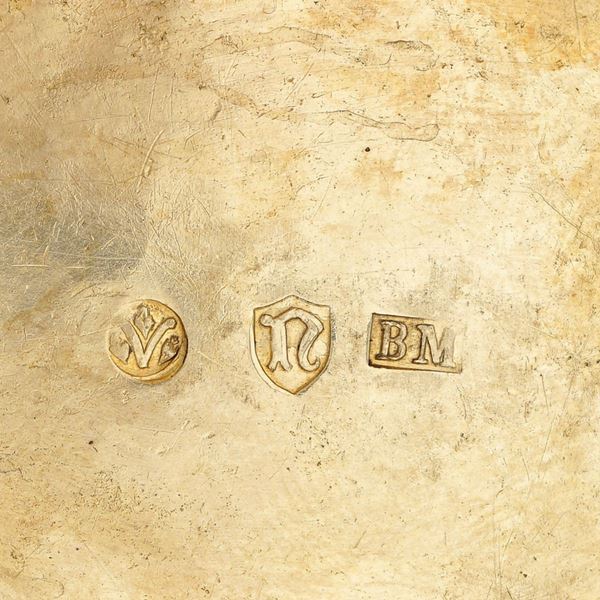 Ludwing Neresheimer goldsmith, composed of a large soup tureen, two stands and four salt cellars, rectangular cups chiselled and embossed with marine patterns and characters supported by figures of Moors resting on rock-shaped bases, lids surmounted by figures representing respectively Triton with chariot drawn by mythological animals and characters with shells drawn by mythological fish, soup tureen measures 49x35x24 cm.  Provenance: Sotheby's Amsterdam, 12 May 2003, peso 8910 gr.