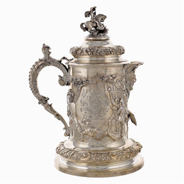 Samuel Smily goldsmith, body centered by the coat of arms of the 1st king's Dragoon Guards embossed and chiselled depicting the battles of Waterloo, Taku Fort, Beijing and Sebastianopoli, profiles decorated with rich floral garlands, lid grip depicting Saint George (patron saint of england) that defeats the dragon, 36x27x20 cm., peso 2634 gr.