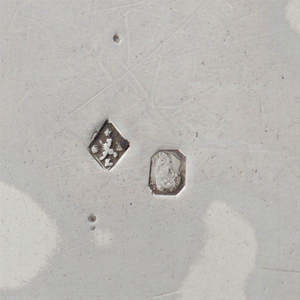 resting on four curled feet, oval shaped body with a rounded shape decorated with floral and vegetal patterns and centered by a monogram within cartouche, shaped line handles, lid with floral shape shaped cimasa, silver interior core, 32x44x30 cm, peso 5760 gr.