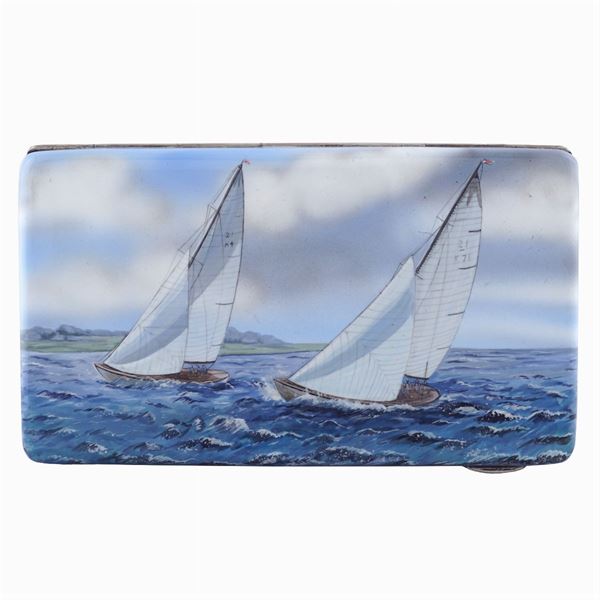 Wilmot Manufacturing Co. goldsmith, rectangular shaped with rounded corners, decorated lid depicting two sailboats, smooth body back, wears, 1x15x9 cm., peso 242 gr.