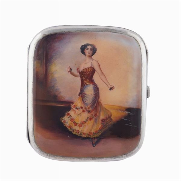 rectangular shape with rounded corners, decorated lid depicting a dancer with castanets, smooth surface back with engraved monogram, wears and defects, 1x8,5x9 cm., peso 152 gr.
