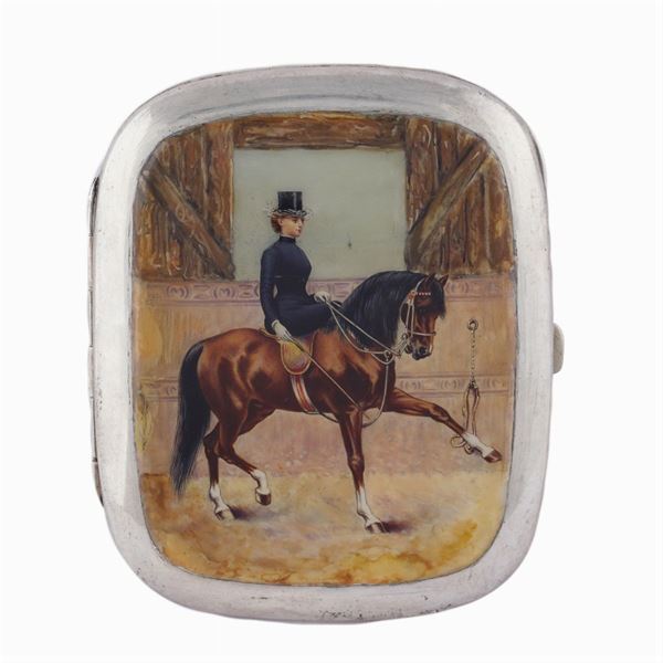 rectangular with rounded corners, decorated lid depicting a female figure riding a horse, smooth back with wears and defects, 1x10x8.5 cm., peso 156 gr.