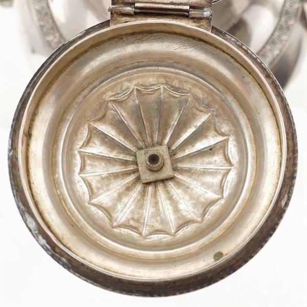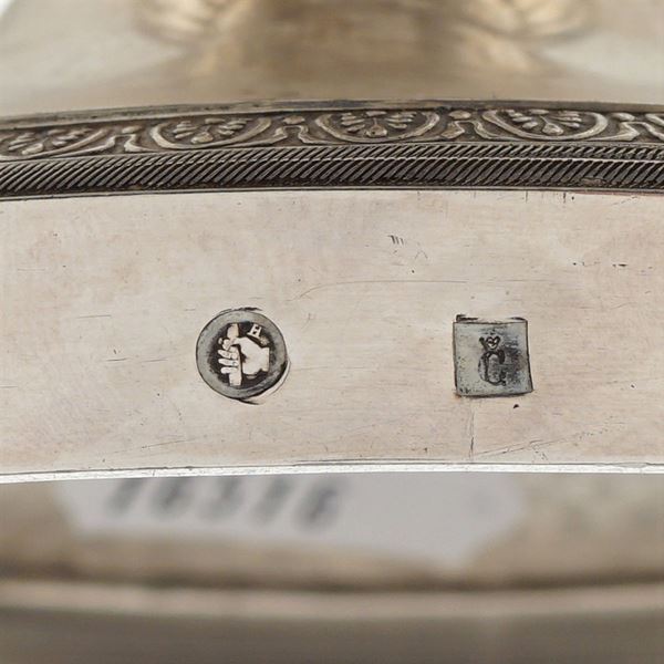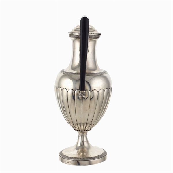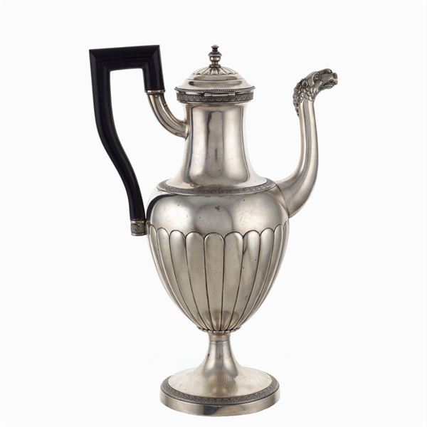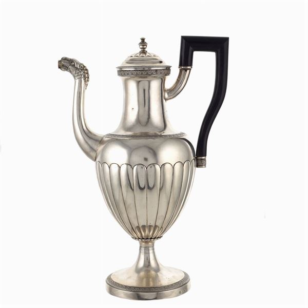 smooth and shaped body, chiseled profiles with impero palmettes patterns, animal-shaped terminal beak, shaped wooden handle, h. 34.5 cm., peso 929 gr.