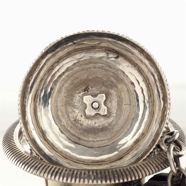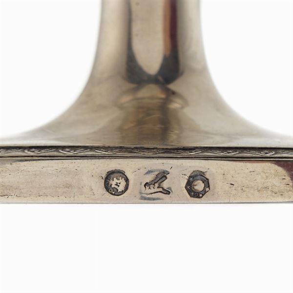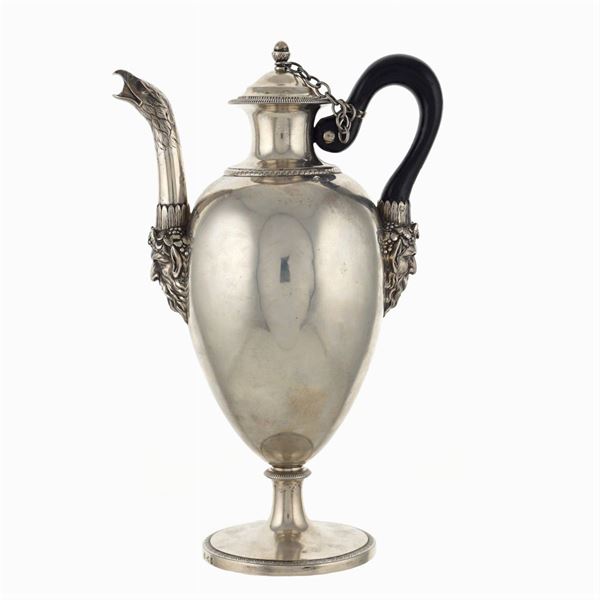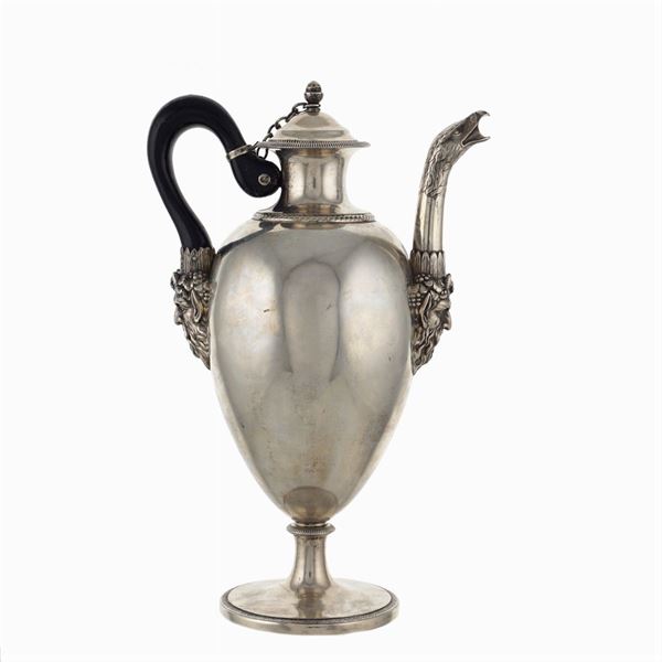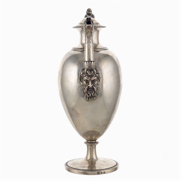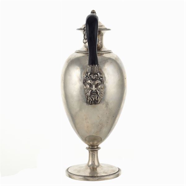 Giovanni Pandini goldsmith, smooth body profiled with palmette patterns and chiseled with baccanali profiles, raptor head shaped lip, wooden wavy line handle, h. 32 cm., peso 1099 gr.