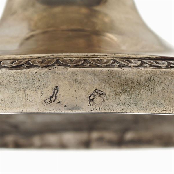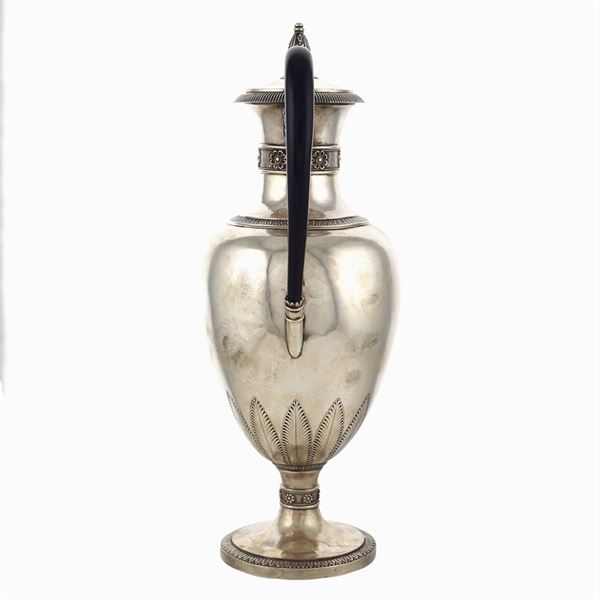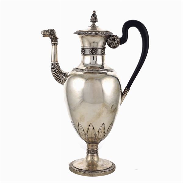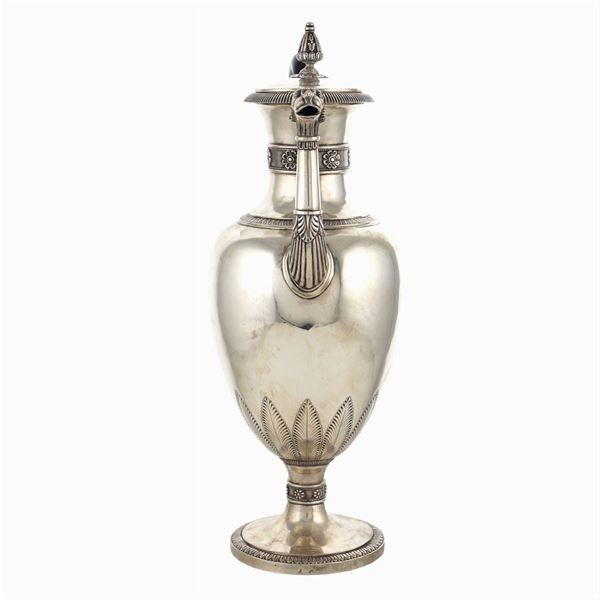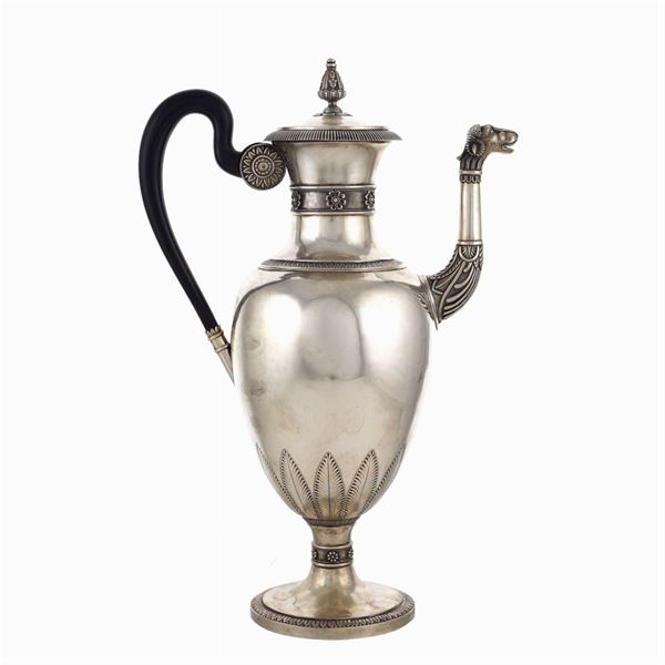 smooth body chiselled and decorated with Impero patterns, aries shaped beak, ebonized wood handle, h. 42 cm., peso 1530 gr.