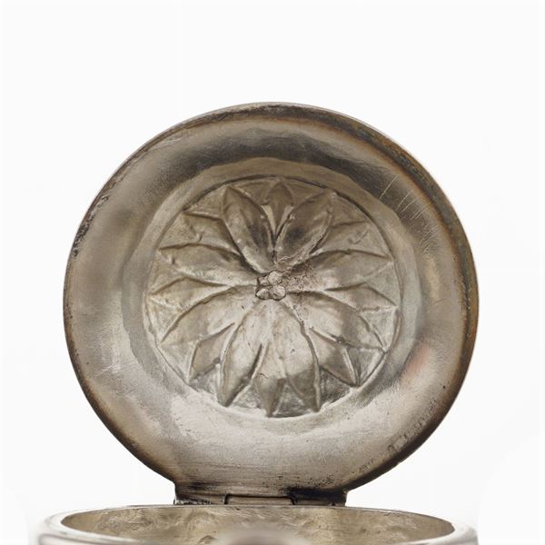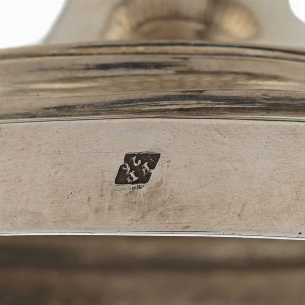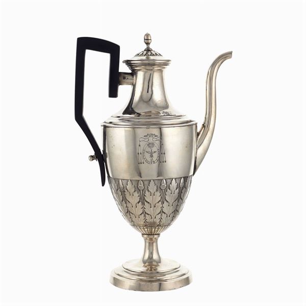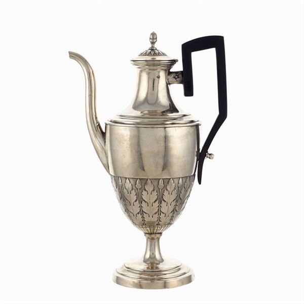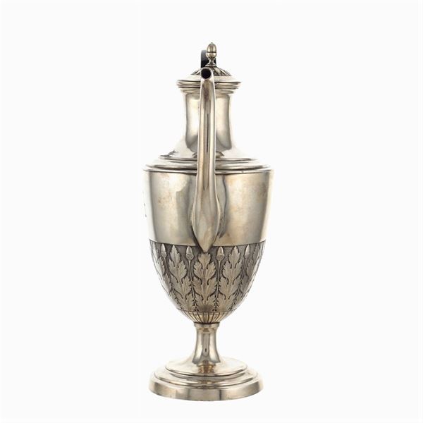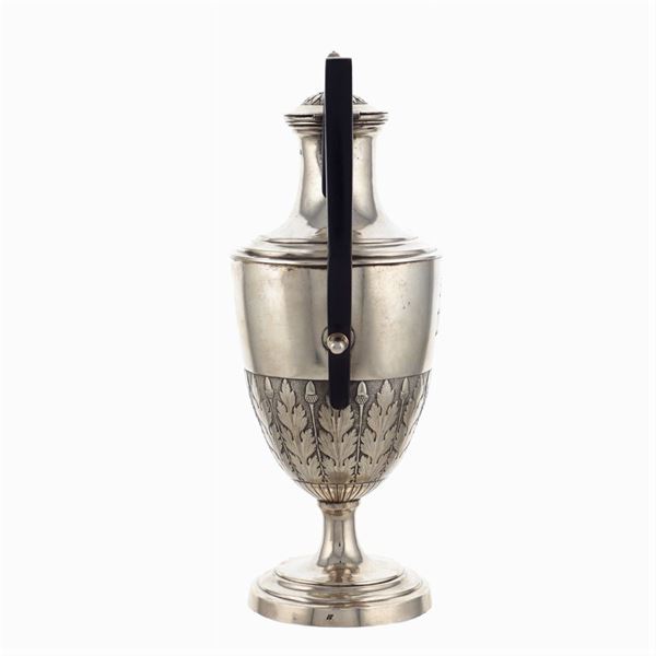 ìgoldsmith, Filippo Pacetti, chiselled smooth body with leaves and pine cones, shaped wooden handle, h. 27.5 cm. Bibliography: Costantino Bulgari - Argentieri, gemmari e orafi d'Italia - Lorenzo del Turco Rome, parte prima, pag 219 marchio n°791 , peso 587 gr.
