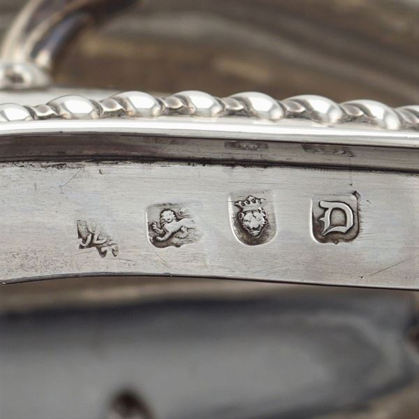Charles Frederick Kandler goldsmith, resting on four feet, oval section body with rounded shape, embossed surface decorated with naturalistic patterns and heraldic crest, knurled profiles, lid with volute shaped grip, shaped line handles, 24x38.5x20.5 cm ., peso 3298 gr.