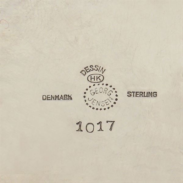 Georg Jensen-Copenhagen goldsmith, designer Henning Koppel, smooth-surfaced piriform body, shaped wooden handle, composed of a teapot, a milk jug and a sugar bowl, h. maximum 15 cm., peso 1,187 gr.