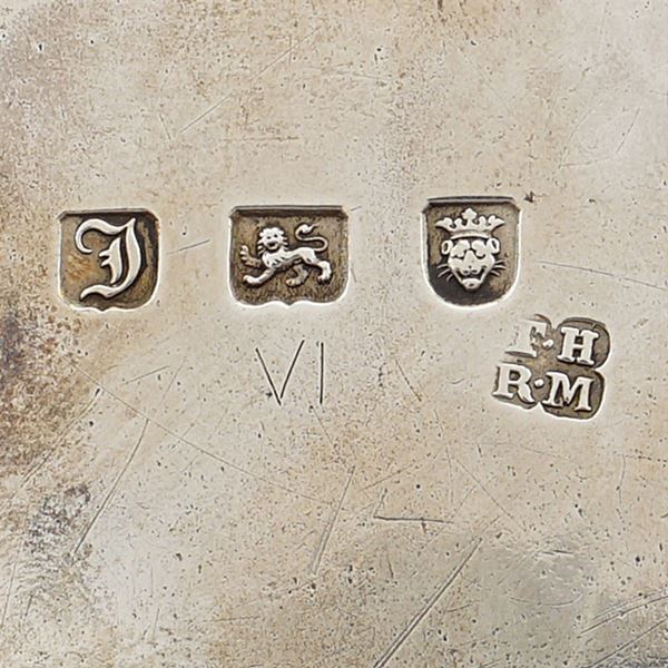 Thomas Hannam & Richard Mills goldsmiths, smooth body centered by a crest engraved with a knurled profile and chiselled with vegetal patterns, resting on three feet, 3x20 cm., peso 360 gr.