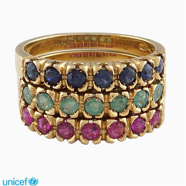 rispettivamente con zaffiri, rubini e smeraldi tondi, misura 14, peso 9,4 gr.