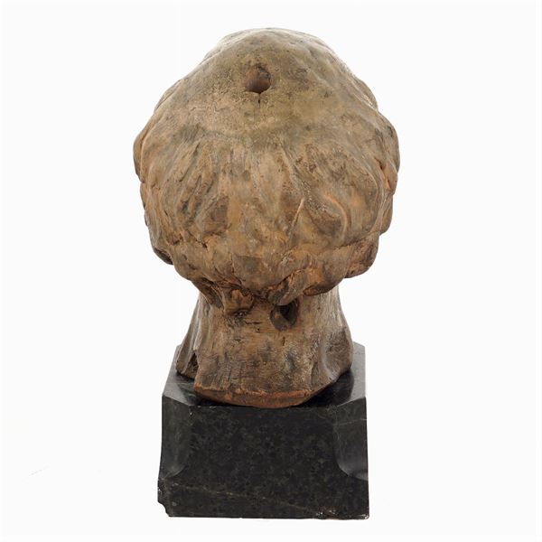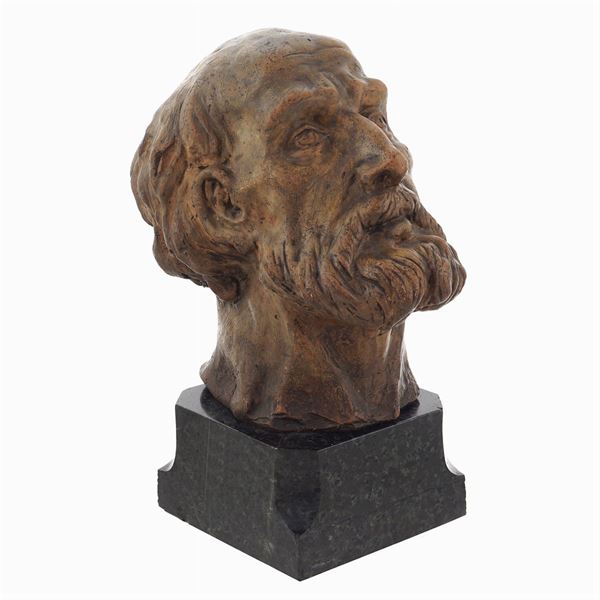 depicting a face of a man with a beard, resting on a dark green marble base, unsigned, h. 27 cm.