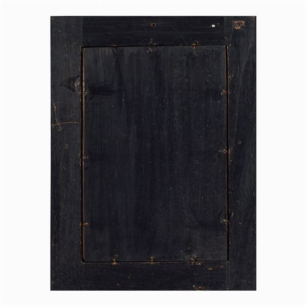 "Madonna with child", miniature on bone sheet, signed and dated C. Caruson. Roma. 1879 at the bottom left, within coeval wood frame inlaid with vegetal, floral and Cupids heads, 29x19 cm.