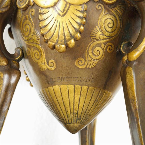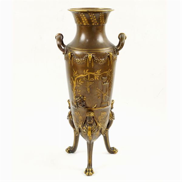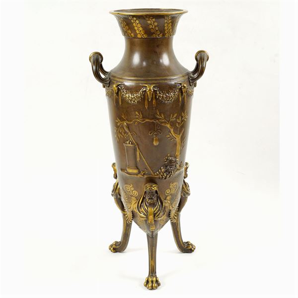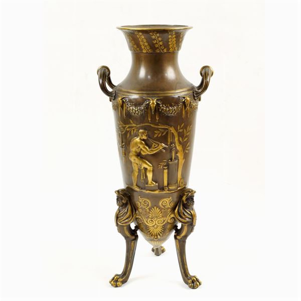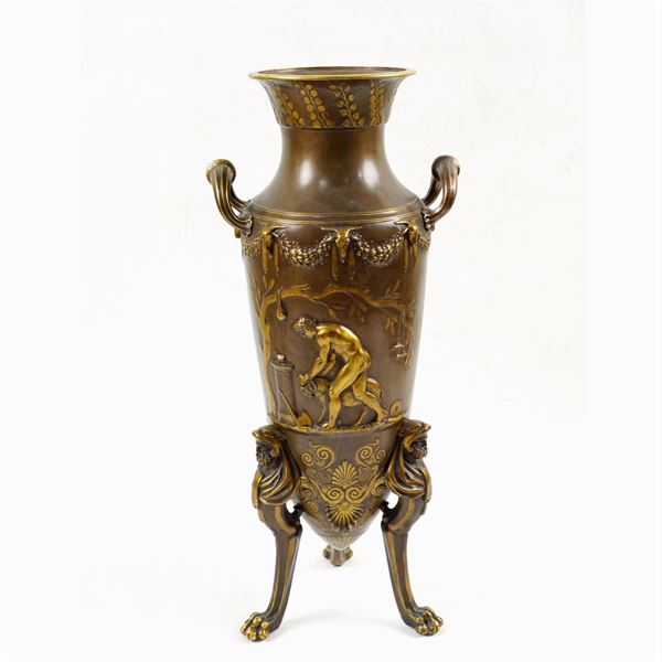 "The Sacrifice", a pair of greek amphoras vases with gilt bronze handles decorated with classical scenes and grapes, musical instruments and garlands, standing on a tripod decorated with Hercules heads, signed by F. Levillain e F. Barbedienne.