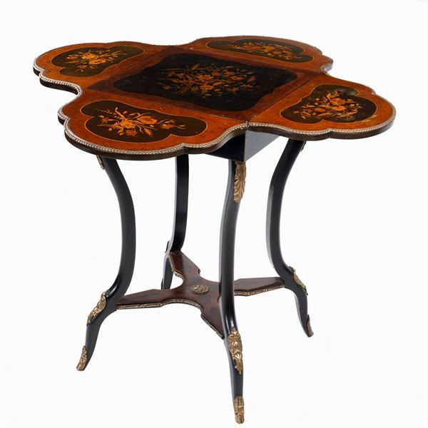 inlaid top with floral and vegetal patterns, shaped legs joined by a stretcher, bronze profiles and linings, slight defects, 73x44x44 cm.