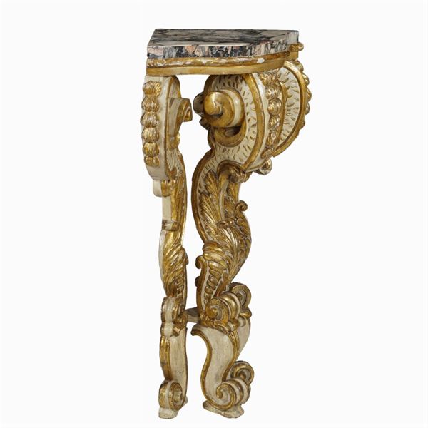 inlaid with vegetal and scroll patterns, african marble veneered shaped tops on peperino, slight defects and wears, 108x57x42 cm.